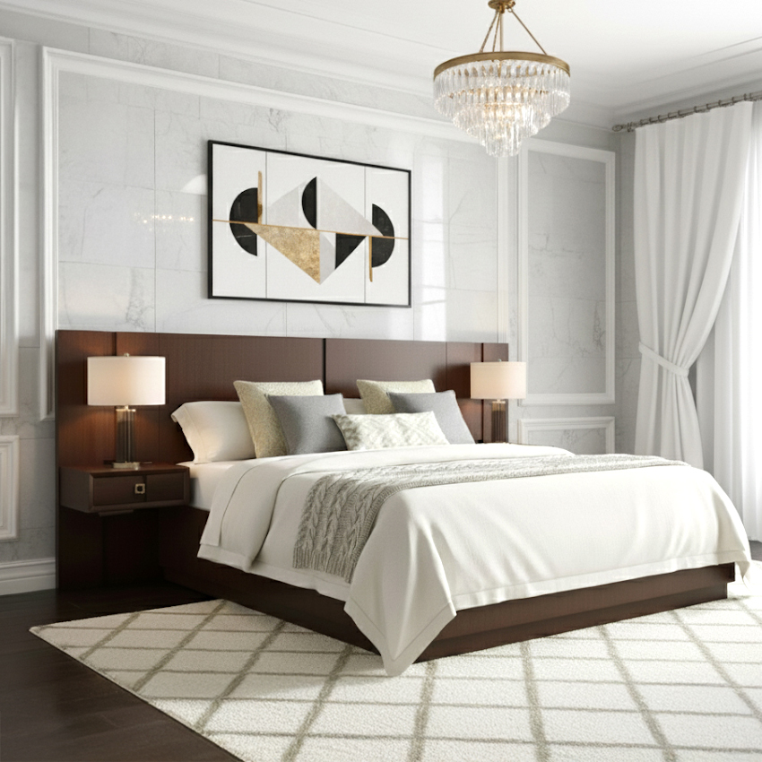 침대가 뒤 협판까지 포함해서 삼미터정도 되는데, 안방이 한층 고급져보여요 신혼부부 방인데, 부모님들도 오셔서 보시고는 너무 이쁘고 우아해 보인다고 하시네요^^ 설치해주시는 분들도 꼼꼼하게 봐주시고! 고급 원목이라 냄새도 거의 안나요 질리지않고 오래오래 잘쓸거같아요 추천합니다~!